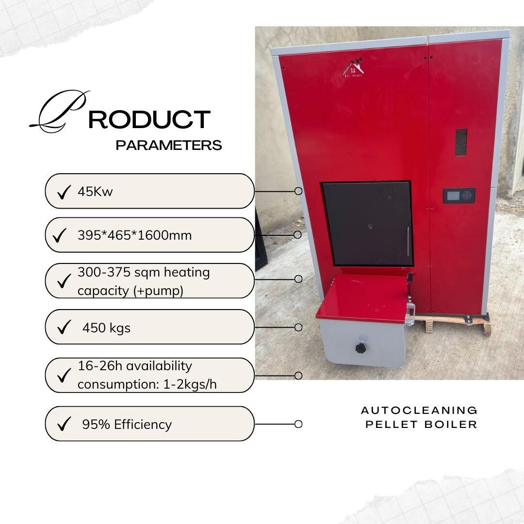 For larger homes, industrial settings, or high-demand heating applications, the 45kW pellet boiler delivers powerful performance, extended autonomy, and superior efficiency. Its high-capacity hopper and intelligent controls ensure longer burn times and minimal user intervention.Specifications: